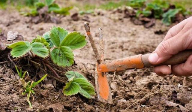 Después de recortar las hojas de fresa, riegue las plantas y afloje suavemente la tierra alrededor del arbusto. La profundidad de aflojamiento debe ser de al menos 10 cm. Para no dañar las raíces, aflojar los pasillos.