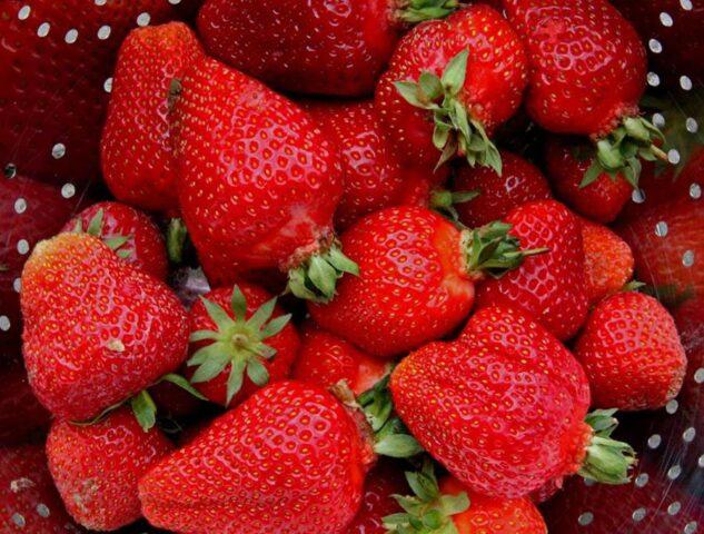 Las bayas son unidimensionales, pesan alrededor de 40 g, son cónicas, la mayoría tienen nervaduras. La piel es del típico color fresa, firme pero fina. Las semillas son pequeñas, amarillentas.