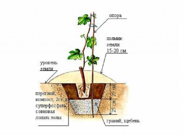 Se coloca una plántula de uva en un hoyo, se cubre con tierra, dejando 2 yemas en la superficie. Al mismo tiempo, se instala un tubo en el pozo, lo que ayuda a que el riego sea de alta calidad.
