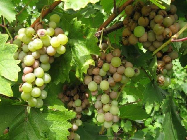 La variedad Zolotinka necesita protección contra el oidio. Sujeto a las condiciones de la tecnología agrícola, la enfermedad es rara. Es difícil curar las uvas Zolotinka afectadas. Es mejor seguir las medidas preventivas. La aparición de la enfermedad es reconocida por el follaje. El plato se vuelve rizado, cubriéndose gradualmente con una flor blanca de moho. Con el tiempo, los síntomas aparecen en flores, vides jóvenes y bayas. Las inflorescencias afectadas se secan y se desmoronan. Las frutas en clima seco se agrietan, se secan o comienzan a pudrirse con mucha humedad.
