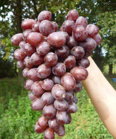 La uva Maradona Red se distingue por un arbusto ramificado de rápido crecimiento. Las flores bisexuales facilitan la polinización sin insectos. Los racimos grandes son muy hermosos. El color rojo con un tinte chocolate crea una presentación atractiva. La disposición de las bayas es medianamente suelta. La forma del racimo es cónica, a menudo crece el doble. El peso medio es de 0,6 a 1,2 kg. Sujeto a las condiciones de la tecnología agrícola, se pueden cultivar cepillos que pesen hasta 2,5 kg.