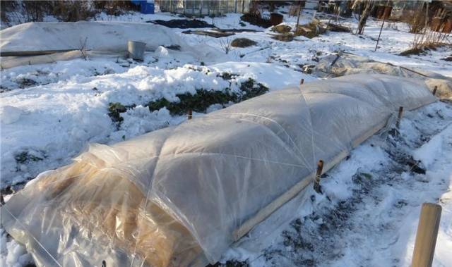 En la parte superior de la vid, puede rociar con tierra o preinstalar varillas arqueadas sobre el refugio, sobre las cuales debe estirar una envoltura de plástico. Desde los lados, la película se rocía con tierra y los extremos permanecen abiertos para proporcionar oxígeno a las enredaderas.
