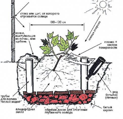 - Es mejor plantar plántulas en el lado sur de las casas de campo. Así que los jardineros experimentados aconsejan colocar las uvas "Russian Early" en sus revisiones. Lo explican por el hecho de que por la noche el edificio desprende el calor acumulado durante el día a las plantas.