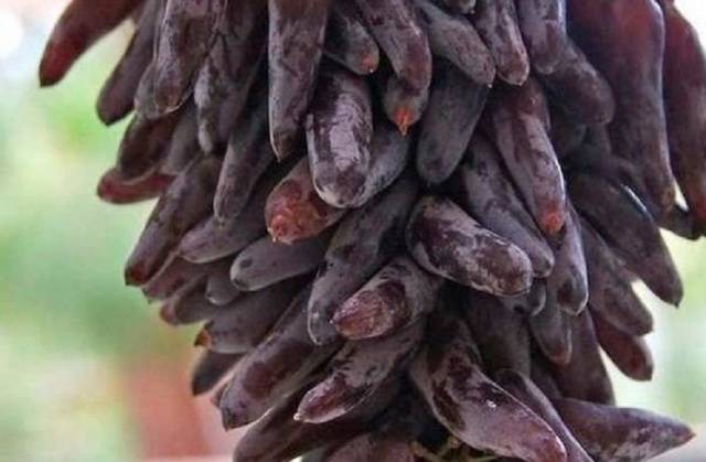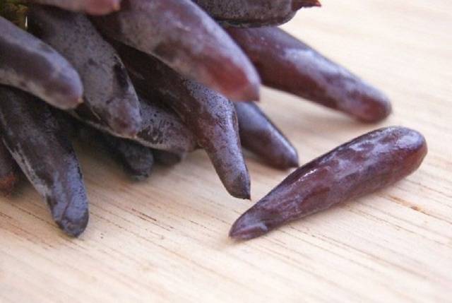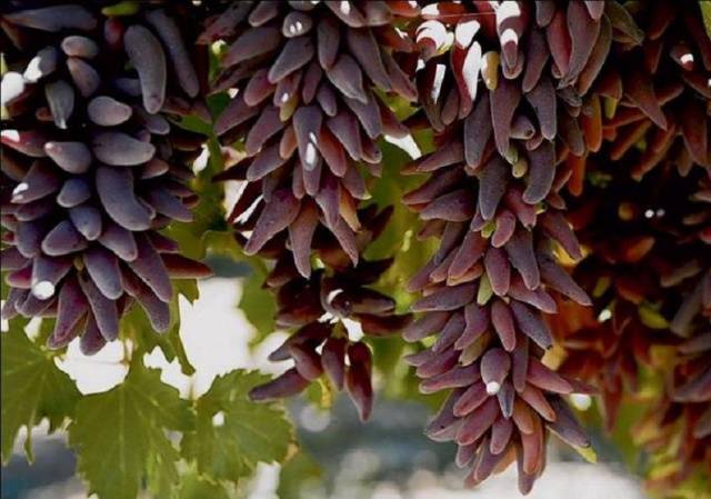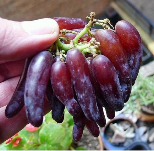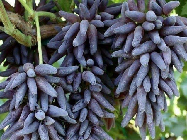 Las uvas inusuales se parecen al pimentón, los jardineros también llaman a la variedad con un nombre diferente: "chile". Pero esta especie no está en absoluto sola. La presencia de clones en ocasiones dificulta la identificación de la variedad, la más parecida es la uva Alyonushka. Las uvas "Dedos de bruja" tienen frutos rojos muy eficaces. Tienen una forma alargada tubular y un color azul oscuro profundo, en algunos lugares con un tinte púrpura oscuro mate. Algunos jardineros notan que las uvas se asemejan a los dedos retorcidos de una anciana. Esto se puede confirmar con una foto del fruto de la uva "Dedos de bruja".