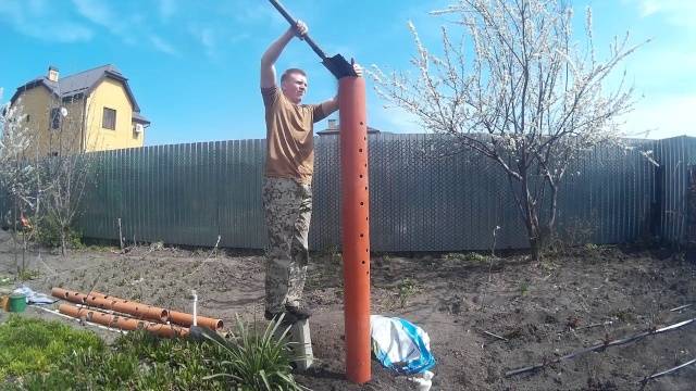 - Al ensamblar la estructura, se inserta un tubo estrecho en una tubería grande de PVC, el espacio entre ellos se llena primero con arcilla expandida o grava (drenaje) y luego se llena el suelo.