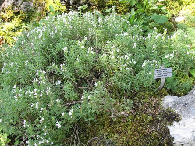 - Ajedrea de montaña (Satureja montana) Crece principalmente en los Balcanes. El arbusto enano exuberante perenne está cubierto de flores blancas. La planta herbácea puede alcanzar una altura de 80 cm.