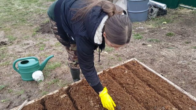 - En el suelo preparado, se hacen hoyos poco profundos a una distancia de 10 cm entre sí. Las filas deben tener una separación de 15-20 cm.