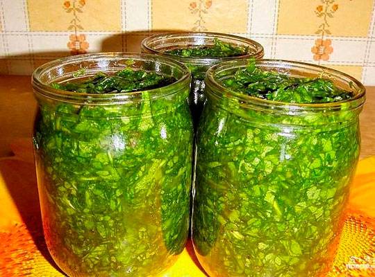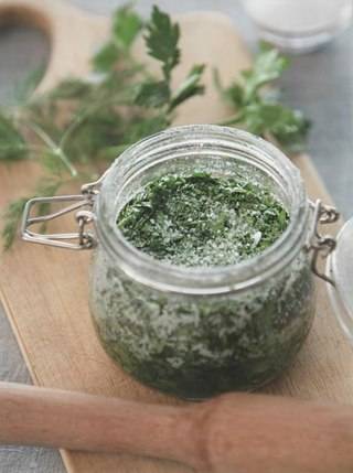 Pica finamente la hierba aromática lavada y seca (cualquiera) y mézclala con sal. Por cada 1 kg de producto, debe haber unos 250 g de sal. Después de mezclar bien, el producto se coloca herméticamente en frascos limpios y se cubre con una tapa de nailon. Durante 2 días, la salazón se coloca en el frigorífico. Durante este tiempo, las verduras en el frasco deben compactarse. En este caso, el espacio libre debe llenarse adicionalmente con una mezcla salada. Guarde los encurtidos preparados en un lugar fresco y oscuro. El compartimento frigorífico es ideal para el almacenamiento.