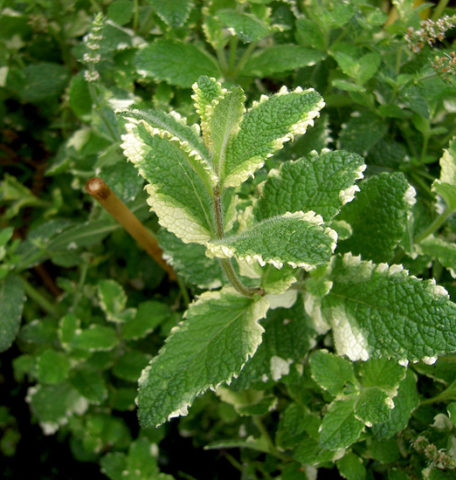 La menta de piña también se llama abigarrada, ya que la planta se destaca entre otros tipos de hojas de color verde brillante con rayas de color amarillo pálido o blanco. Las láminas de las hojas son redondas, no demasiado grandes, con arrugas bien visibles. Bordes dentados.