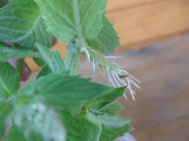 - Esquejes. Como esquejes se utilizan las partes jóvenes apicales de los brotes de menta rizada de 10-15 cm de largo, se cortan y se colocan en agua. Muy rápidamente, los esquejes comienzan a formar su propio sistema de raíces en el agua, después de 1.5-2 semanas, las primeras raíces se pueden ver en los puntos de corte.Después de que alcancen una longitud de 2-3 cm, se pueden trasplantar al suelo en un lugar previamente preparado.
