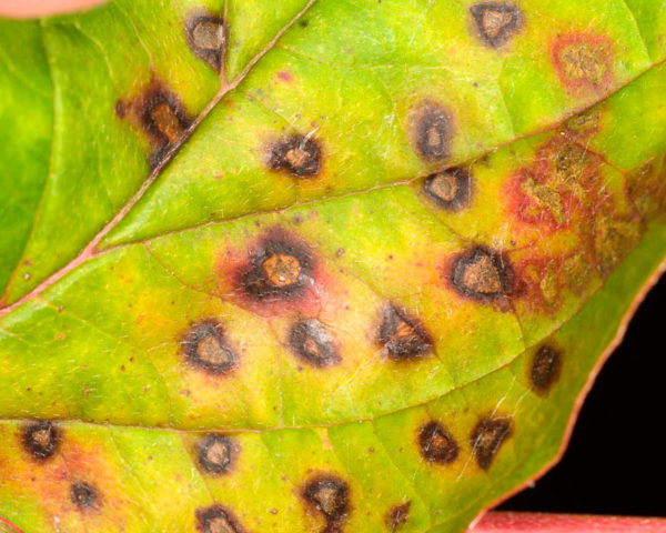 - Septoria. Se manifiesta en forma de pequeños puntos de luz claramente delineados con un borde oscuro, en lugar de los cuales se forman focos de tejido muerto, que se colapsan gradualmente. Septoria se manifiesta con mayor frecuencia en condiciones de alta temperatura y humedad.