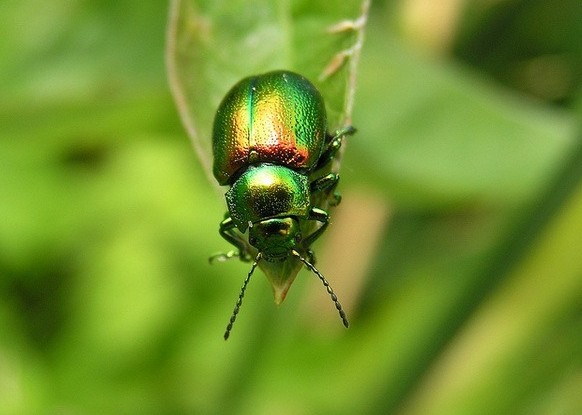 Exteriormente, la plaga parece un error de 3-4 mm de largo. Color: esmeralda con brillo azul metálico. Las hembras tienen un abdomen grande, se mueven mucho más lento que los machos. Las alas están completamente desarrolladas. Las plagas comienzan a alimentarse inmediatamente después de la invernada, tan pronto como aparecen las primeras hojas. Al final de la primavera, los escarabajos verdes se aparean y ponen huevos. Después de poner huevos, pasa una semana, aparecen las primeras larvas de la plaga. Luego tiene lugar el proceso de pupación, que tiene lugar en el suelo. Un adulto emerge de allí, una nueva plaga.