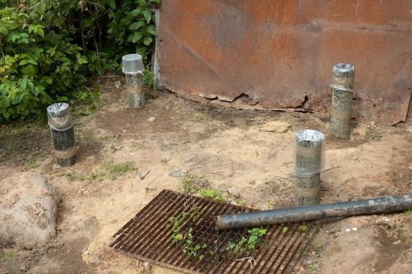 Hay muchos tipos de cimentaciones, pero si Ducha de verano para una residencia de verano, está hecho de policarbonato, luego es suficiente para colocar pilas en las esquinas donde se colocará la cabina. Para hacer esto, perfore cuatro orificios con una profundidad de 1–1,5 m. Se introducen trozos de tubería de metal o asbesto con un diámetro de 100 mm en los orificios. El espacio alrededor de las tuberías y el interior se vierte con hormigón, y se instala una varilla de anclaje dentro de cada tubería antes de verter. En el futuro, el marco de la cabina de ducha se fijará a esta horquilla.