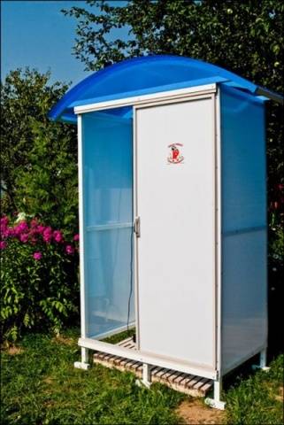 Rara vez alguien en el país construye una lluvia de capital con un ladrillo o bloque de cemento. Por lo general, su uso se limita a tres meses de verano y luego durante la plantación de un huerto, así como durante la cosecha. Durante un período tan corto, es suficiente construir una cabina de luz con cualquier material de hoja. Una buena opción es una ducha de policarbonato con vestuario, que es fácil de diseñar y hacer tú mismo.