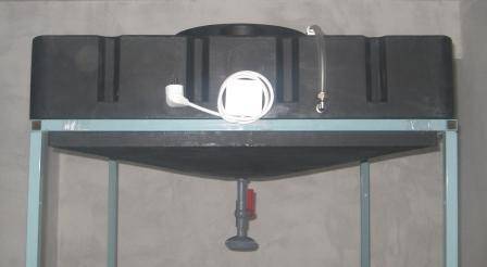 El final de la construcción de una ducha campestre con vestuario es la instalación de un tanque. Es mejor usar un recipiente de plástico calentado de fábrica. Un tanque de 100 litros es suficiente para una familia de cinco.
