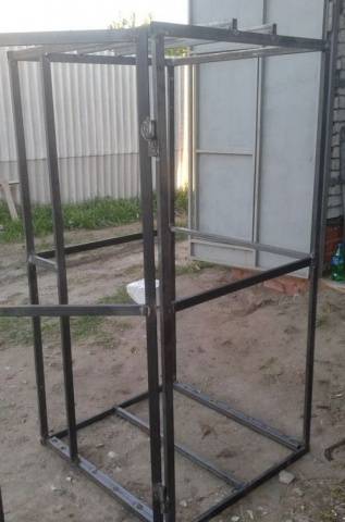 Para la fabricación del marco de ducha, lo óptimo es tomar un perfil con una sección de 40x60 mm. Una esquina de metal también funcionará, pero con un ancho mínimo de estante de 25 mm. El marco de la ducha se suelda por separado de la base. En las esquinas colocaron los pilares principales, y dos adicionales al frente para colgar puertas. El marco de la hoja también se suelda del perfil. Se fija al pilar de la puerta con bisagras.
