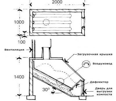 El fondo de la cámara inferior se realiza con una pendiente de 30sobre, con pequeños agujeros perforados en toda la superficie. Actúan como un filtro. Los desechos líquidos se filtran a través de los orificios. La turba se vierte en la cámara a través de la ventana de carga. El abono terminado se descarga por la puerta inferior.