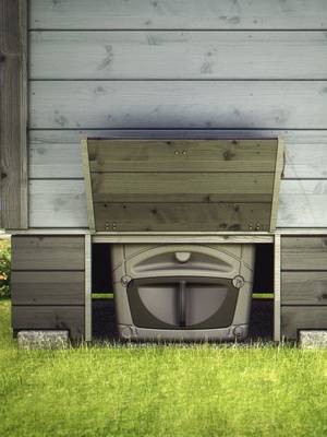 La cámara de recogida de residuos sólidos se encuentra dentro del cuerpo del inodoro de turba. El tanque de residuos líquidos se encuentra en el exterior y está conectado al sistema general mediante una manguera. El líquido filtrado se utiliza para fertilizar flores o como activador de compost. Todos los tanques de almacenamiento están equipados con dispensadores con función de absorción de olores. -