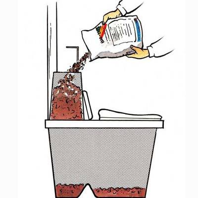 Antes de usar el inodoro de compost para dar, se vierte turba de la bolsa en el recipiente superior. El tanque tiene aproximadamente 2/3 de su capacidad.
