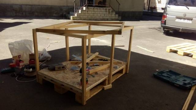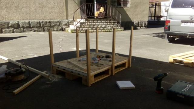 - En las esquinas y en el centro de los lados largos del palet, clavamos racks de una barra con una sección de 50x50 o 40x40 cm.