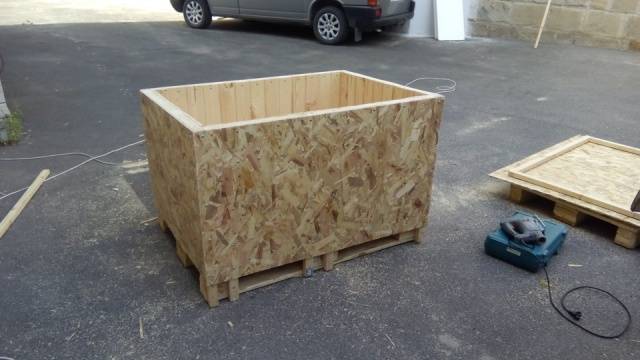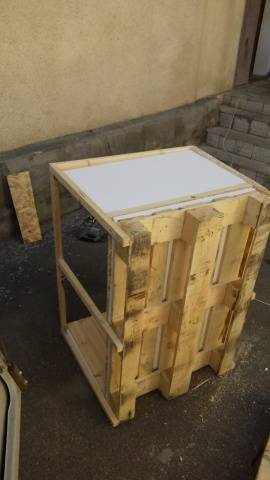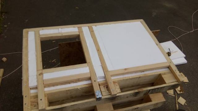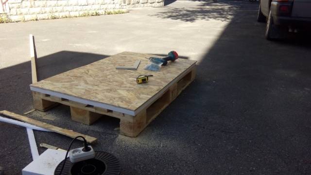 - Gracias al palet, tendremos una cabina con patas, y la humedad y el agua de lluvia no penetrarán en su interior. Hacemos la casa aislada, por lo que colocamos una lámina de espuma de plástico de 20 mm de espesor en el palet, y en la parte superior sujetamos la placa OSB con tornillos.
