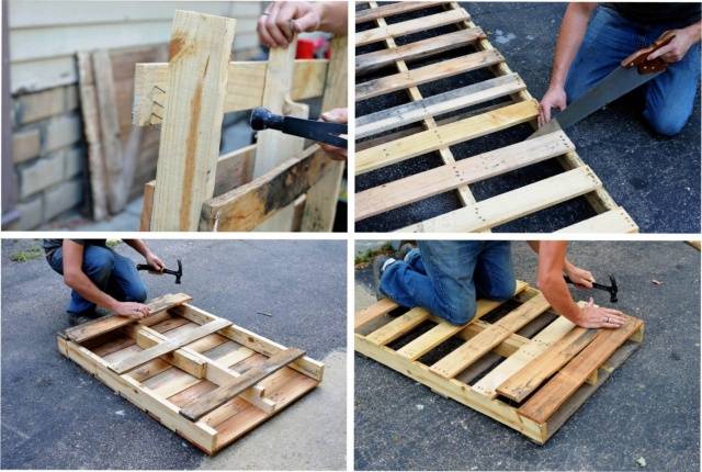 Las partes de los palets desmontados deben clasificarse inmediatamente. Las tablas se utilizarán para cubrir la perrera y el marco de la casa se hará con madera.