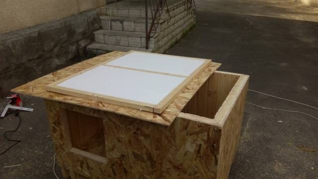- De la losa OSB con una sierra de calar eléctrica, cortamos cuatro rectángulos de acuerdo con los tamaños de los lados de la caja, y de ellos hacemos la carcasa exterior de la cabina. En la pared frontal, donde debería estar el agujero, cortamos la ventana en el OSB con la misma sierra de calar.