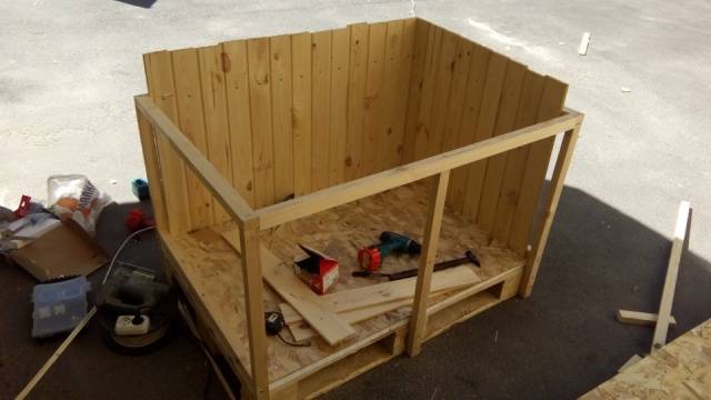 - Envainamos el marco de la cabina con tablas desde el interior. Para el trabajo, los pallets se tomaron viejos, por lo que pueden tener muchas virutas astilladas. Para que el perro no se lastime, trituramos bien todas las tablas con papel de lija.