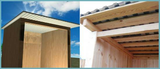 Para el techo, clavamos una caja desde la tabla al marco superior del marco de la casa. Fuera de la caja, basta con proporcionar una salida de 30 cm para que la lluvia no moje las paredes del inodoro. Fijamos cualquier hoja de material para techos a la caja. El cartón ondulado, los azulejos metálicos o la pizarra ordinaria servirán.