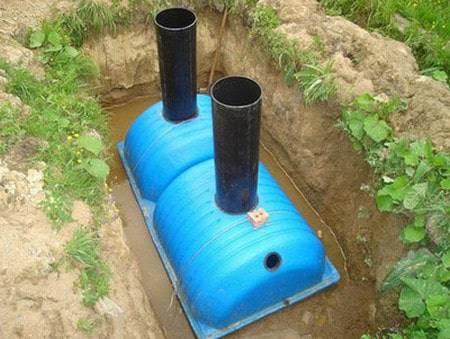 Si la construcción de un baño en el país es imposible debido al agua subterránea, un recipiente de plástico vendrá al rescate. El pozo se excava un poco más grande que las dimensiones del tanque. El trabajo en un sitio de este tipo se realiza durante un período en el que el agua subterránea es baja. Debajo del recipiente de plástico, el fondo debe estar hormigonado y 4 bucles de metal se fijan a la malla de refuerzo. Deben sobresalir del hormigón en altura para que el tanque de plástico se pueda atar a las bisagras. Esto se hace para que, cuando se eleve, el agua subterránea no empuje el contenedor de luz fuera del suelo como un flotador.