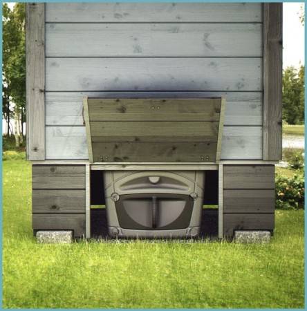 Armario de contragolpe del inodoro representa el mismo baño de campo con un pozo negro, que se puede ver en la foto. La diferencia de diseño es el tanque de almacenamiento en sí. En su forma, se aumenta el pozo negro desde el lugar de instalación del asiento del inodoro hasta el acumulador general. Además, el fondo del tanque está hecho con pendiente. Esto permite que los residuos sean transportados por gravedad al almacenamiento general. El pozo negro del armario de reacción del país se hace hermético y aislado. Puede usar dicho sistema en un inodoro al aire libre para una residencia de verano o un baño dentro de la casa. Es aconsejable construir un armario de reacción en el interior en la etapa inicial de la construcción de una casa de campo, ya que el muro de carga del edificio está en riesgo.