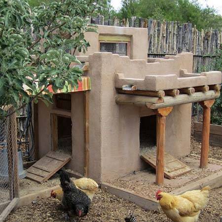 - El gallinero inusual se presenta en un estilo español. La construcción de capital se realiza sobre los cimientos. Las paredes del gallinero están enlucidas en la parte superior. Incluso puedes pintarlos por su belleza. Las gallinas ponedoras vivirán en un gallinero de este tipo en invierno. Paredes gruesas, pisos y techos aislados evitan que las aves se congelen.