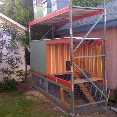 - Este proyecto de gallinero está diseñado para pollos de verano. Se basa en una estructura de metal. El nivel inferior se reserva tradicionalmente para un aviario. El segundo piso está destinado a una casa. También hay un tercer nivel, pero no se permite el acceso a las gallinas. Este piso estaba formado por dos cubiertas.El techo superior protege el techo de la casa del sol. El gallinero está siempre a la sombra y mantiene una temperatura favorable para los pollos incluso en verano.