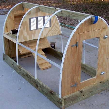 - La idea original de un hermoso gallinero se presenta en forma de invernadero. En principio, se obtiene un gallinero económico. Un marco arqueado está hecho de tablas, tubos de plástico y madera contrachapada. En primavera se puede cubrir con plástico y utilizar como invernadero. En el verano, se arregla una casa para pájaros en el interior. En este caso, parte del marco se cubre con policarbonato y se coloca una malla sobre el camino.