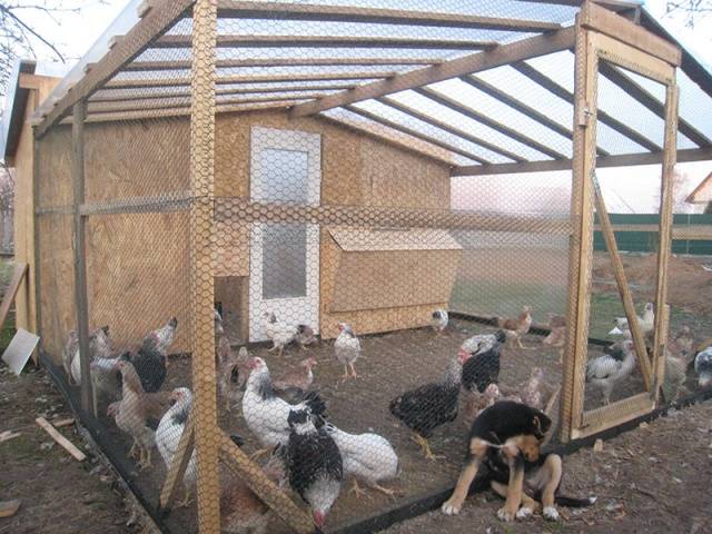 - Un gallinero equipado de acuerdo con todas las reglas consta de dos partes: un establo y un paseo. Ya hemos descubierto la habitación, pero la segunda parte es un aviario o corral. Caminar se puede llamar de otra manera, pero su diseño es el mismo. El aviario de pollos es un área vallada con una malla metálica. Siempre está sujeto al gallinero desde el costado de la boca de alcantarilla. En la cerca, las gallinas caminan todo el día en verano. El tamaño del corral es igual al área del gallinero, y es mejor doblarlo.