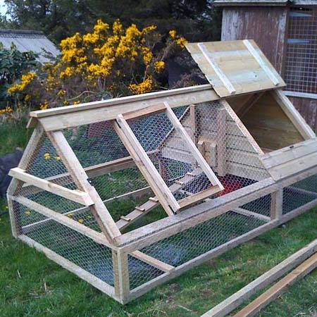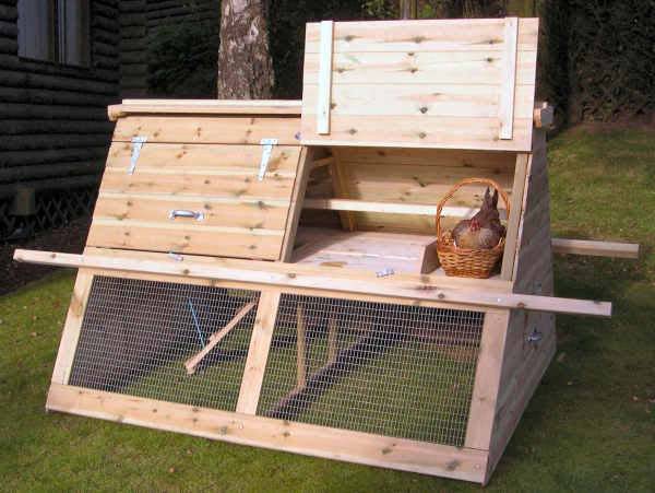 - Me gustaría completar la reseña de gallineros con la opción más económica. Este mini gallinero se puede hacer con cualquier material de construcción sobrante. El marco se derriba de trozos de madera. La parte superior está cubierta con una malla. La casa triangular está hecha de tablones. Se instala una puerta abatible para su mantenimiento.