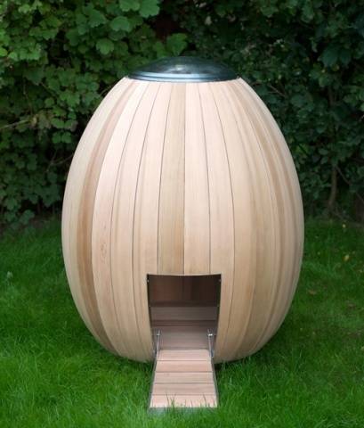 - El diseño del gallinero depende de las preferencias y las capacidades financieras del propietario. Puede construir un granero rural tradicional y esconderlo más atrás de la casa o en el jardín. Si lo desea, se erige un gallinero de diseño. La foto muestra un ejemplo de una pequeña casa en forma de huevo.