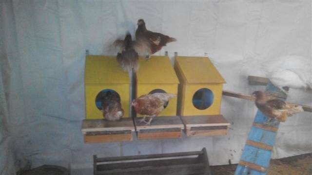 - Los nidos en el gallinero están equipados con al menos 30 cm de altura desde el piso y están hechos de cajas, madera contrachapada, cubos de plástico y otros materiales a mano. No todas las gallinas pondrán al mismo tiempo, por lo que se hacen 1-2 nidos para cinco capas. Para evitar que los huevos se rompan, use una ropa de cama suave. El fondo del nido está cubierto con aserrín, heno o paja. Cambie la arena a medida que se ensucie.