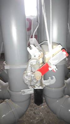 Los comederos regulares deben llenarse con alimentos a diario, o incluso tres veces al día. Esto ata al propietario a la casa, evitando que esté ausente durante mucho tiempo. Los alimentadores hechos de tuberías de alcantarillado de PVC con un diámetro de 100 mm ayudarán a corregir la situación. Para hacer esto, se colocan una rodilla y media rodilla en una tubería de un metro de largo y luego se fijan verticalmente dentro del cobertizo. Se vierte una gran cantidad de alimento en la tubería desde arriba. Debajo, el alimentador se cierra con una cortina.