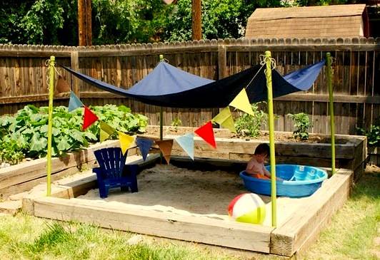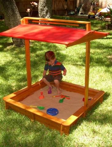 Una caja de arena ordinaria, representada por un marco de madera hecho de vigas, también se puede cubrir con una lona o tela resistente a la humedad, que durante el juego actuará como techo y protegerá al niño de los rayos del sol. Para hacer esto, en el marco de una estructura de madera en las esquinas, debe instalar barras en las que se fija la lona mientras la caja de arena está abierta.