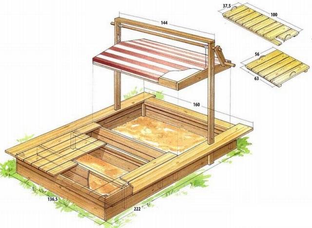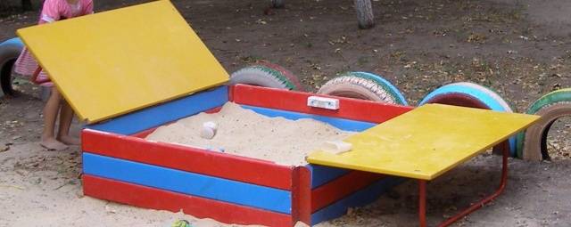 Puede modernizar un modelo tan simple de caja de arena casera con la ayuda de soportes que sostendrán las solapas de la tapa cuando se abra la caja de arena. En tales solapas de la tapa, los niños pueden sentarse mientras juegan o usarlas como mesas. Los soportes de las tapas se pueden hacer con piezas de refuerzo dobladas, barras de madera martilladas, patas de una vieja concha. Un ejemplo de una caja de arena tan funcional con tapa se puede ver en la foto a continuación: