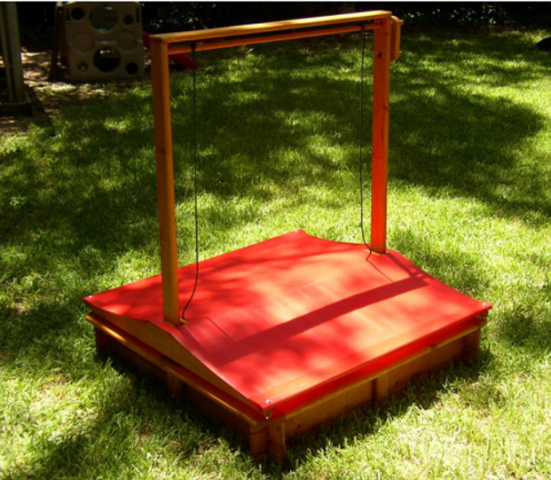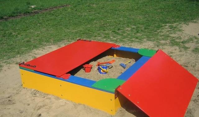 La caja de arena que se muestra en la foto de arriba es un marco de madera ordinario para arena, hecho de acuerdo con la tecnología ya mencionada anteriormente, una cubierta de plástico y un dispositivo para subir y bajar. Vale la pena señalar que la cubierta en sí puede estar hecha no solo de plástico, sino también de madera, madera contrachapada resistente a la humedad.