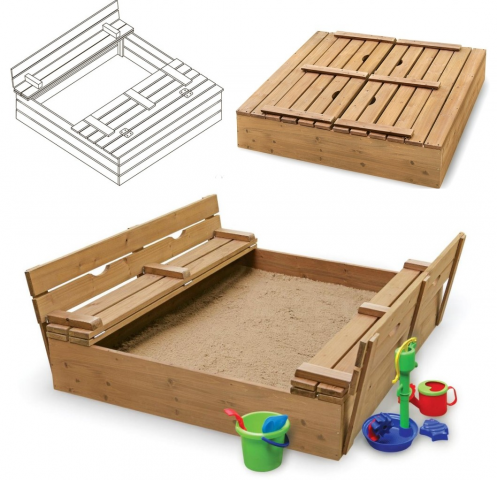 Un elemento de la caja de arena, como una tapa, no solo puede proteger la arena, sino que también puede realizar otras funciones importantes. Entonces, puede construir una caja de arena transformadora, donde la tapa se convierte en un cómodo asiento o dosel que protege del sol durante el juego del bebé.