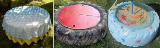La opción más fácil para hacer una caja de arena en el campo con sus propias manos es instalar un neumático de rueda de máquina. Este material no es particularmente atractivo, pero con un poco de esfuerzo puede crear una caja de arena divertida y colorida. Para hacer esto, debe cortar total o parcialmente la llanta del neumático en un lado y pintar el resto con pinturas multicolores. Como cubierta para proteger la arena en dicho marco, puede usar una pieza de polietileno, lona o madera contrachapada, como se muestra en la foto. Esta cobertura, por supuesto, no conllevará una carga funcional adicional, pero tampoco requerirá gastos financieros y de tiempo.