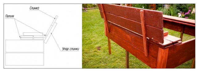 - La parte posterior del banco también es una conexión rígida de dos tablas. Se fijan al asiento con dos bisagras de puerta más. En la parte trasera del respaldo, se fijan 2-4 barras de tope, que no permitirán que el respaldo se recline completamente.