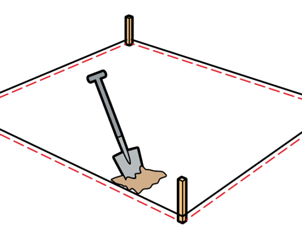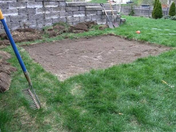 - Con la ayuda de una bayoneta y una pala, se retira una capa de tierra de césped en el área marcada. Debe obtener una hendidura cuadrada de hasta 30 cm. Quitar el césped evitará que crezcan malas hierbas debajo del fondo del arenero de los niños, así como los residuos de hierba podrida.