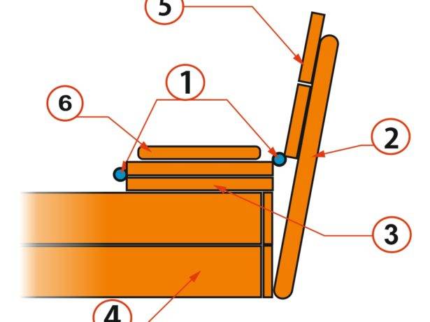 En la foto, el número 4 indica la casilla. Conocemos su tamaño. El número 3 indica el asiento del banco con un ancho de 17,5 cm Hay dos elementos de este tipo en el banco. El respaldo del banco, que es el tercer módulo de la funda abatible, está designado con el número 5. Su ancho es de 40 cm. Los números 2 y 6 indican los topes del respaldo, este último desempeñando además el papel de pasamanos. El número 1 indica las bisagras que conectan los módulos plegables. El elemento debajo del número 3 es fijo y se fija en mayúsculas a los lados de la caja.