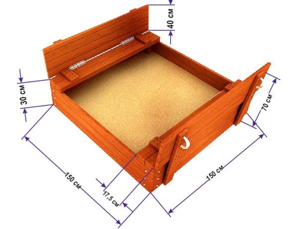 Al determinar la altura de los lados, es importante recordar que la tapa del arenero para niños se plegará en dos bancos. Se proporciona una distancia óptima entre el asiento y el relleno para que el niño pueda colgar cómodamente las piernas.