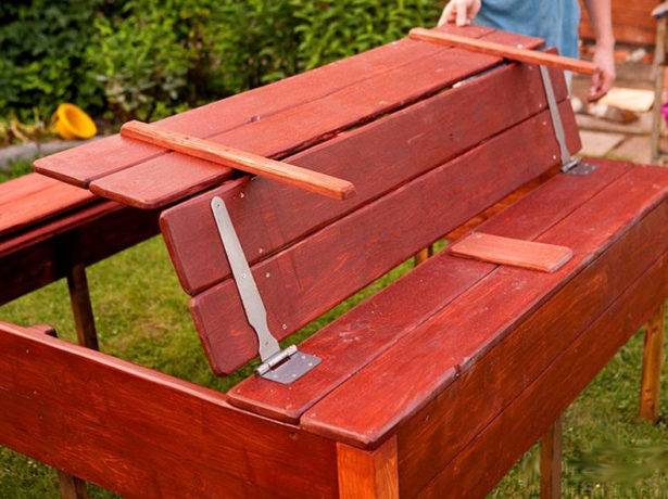 - En la parte posterior de la parte posterior del banco, se adjuntan dos limitadores de los rieles. En el estado desplegado de la tapa, descansarán en el costado del arenero de los niños. Dos sujeciones más están unidas a la base del asiento. Evitarán que el respaldo se caiga hacia adelante, además de que harán el papel de pasamanos.