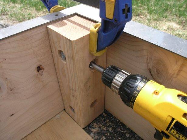 - Puede conectar las tablas a las barras con clavos, tornillos o pernos. Cuando utilice el hardware más reciente, es necesario asegurarse de que no haya tuercas ni cabezas de pernos que sobresalgan en la superficie. Para esto, el hardware se selecciona con una longitud ligeramente menor que el grosor de los espacios en blanco que se van a unir. Los agujeros pasantes se perforan con un taladro delgado, de acuerdo con el diámetro de la parte roscada del perno. Luego, tome un taladro un poco más grueso que el diámetro de la tuerca y la cabeza del hardware y taladre pequeños huecos en los orificios terminados. El resultado final es una junta atornillada escondida en la madera.